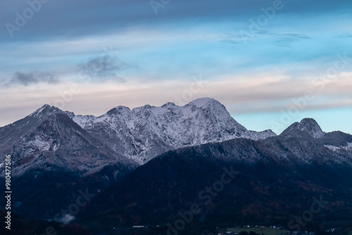 Scenic view of snow-capped mountain peak Mittagskogel (Kepa) in Karawanks at sunrise seen from Rosental, Carinthia, Austria. Cloud covered alpine landscape. Peaceful scene in Austrian Alps in winter