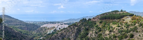 Scenic view of surrounding mountains and picturesque village from a hiking trail along an old irrigation ditch in Frigiliana, Spain.