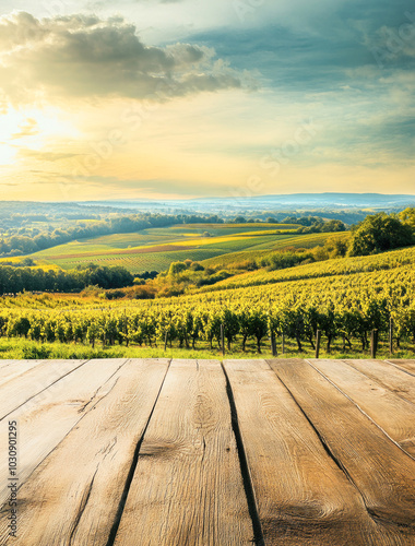 Scenic vineyards with wooden deck overlooking rolling hills at sunset