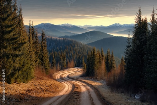 Scenic Winding Dirt Road Through Pine Forest with Mountain Landscape Under Golden Hour Light