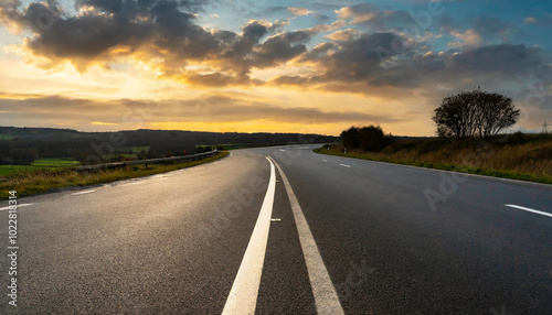 sunset, road, winding road, countryside, landscape, cloud, hill, greenery, sky, nature, path, travel, adventure, evening, asphalt, outdoors, scenery, horizon, calmness, rural, journey, drive, weather, sunlight, peaceful, scenic, curve, transportation, earth, open road, exploration, vehicle, direction, highway, solitude, beauty, vista, scenic route, natural beauty, picturesque, warm light, panoramic, late afternoon, atmosphere, environment, leisure