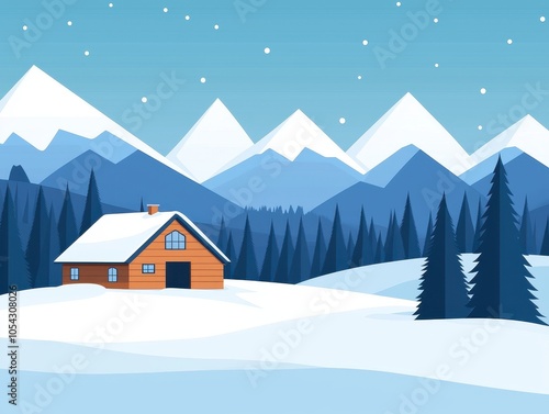 Scenic winter landscape with snow-covered mountains and a cozy wooden cabin in a serene setting.