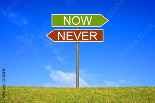 Schild zeigt in Richtung Now oder Never