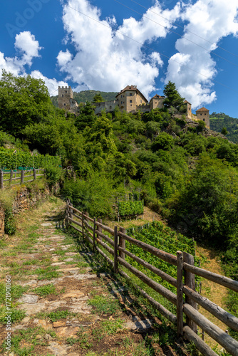 lock, castle, palace, building, stone, wall, tower, mountain, mountain, alpen, tree, forest, fence, way, forest, heaven, cloud, countryside, architecture, south tyrol, italy, blue, green, sheer, mighty, mediaeval