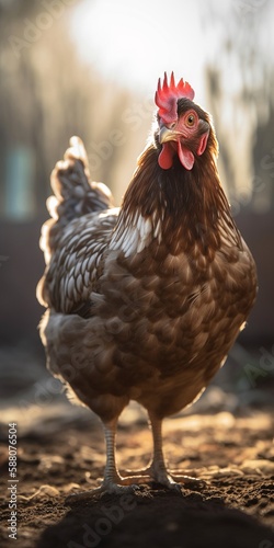 Schöner Hahn mit rotem Kamm im Sonnenlicht Nahaufnahme, ai generativ