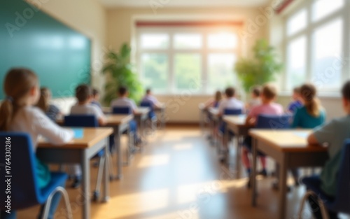 School classroom in blur background without young student. Blurry view of elementary class room no kid or teacher with chairs and tables in campus. Back to school concept. High quality
