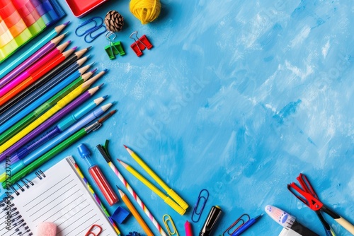 School supplies arranged on a blue background, back to school theme with ample copy space for text