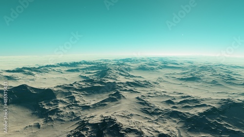 science fiction illustration, alien planet landscape with strange rock formations, fictional space scene, rocky hills and mountains