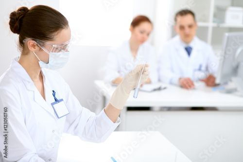 Scientific research team with clear solution in laboratory