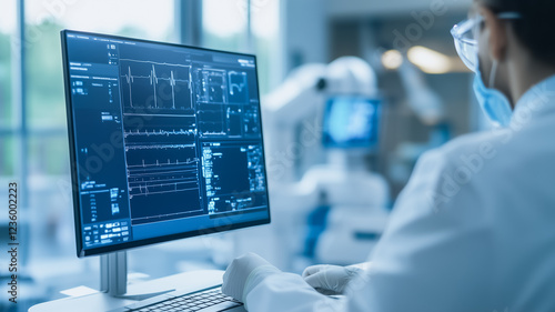 scientist, researcher, laboratory, computer-screen, technology, science, health care, medicine, analysis, research, innovation, diagnostic, screen, datum, information, monitoring, progress, discovery, investigation, exam, expertise, precision, accuracy, sharpened, concentration, modern, professional, advanced, development, study, experiment, healthcare professional, medicals, hospital, clinical, scientific, careful, diligent