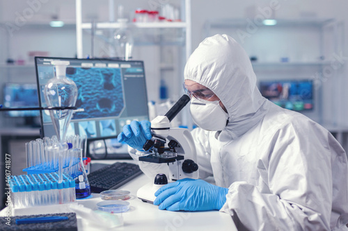 Scientist changing microscope lenses in time of coronavirus experiment dressed in ppe suit. Virolog in coverall during coronavirus outbreak conducting healthcare scientific analysis.