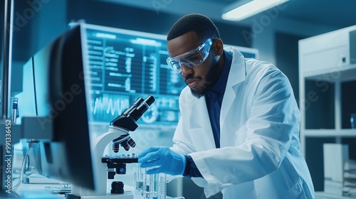 Scientist conducting research with high-tech lab tools, including microscopes and digital analysis equipment