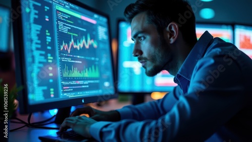 Scientist examining complex financial charts, highlighting the meticulous process of data interpretation and big data management in real time.