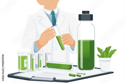scientist, test, tube, liquid, green, research, medicals, science, health care, laboratory, bottle, plant, capsule, clipboard, analysis, experiment, biology, chemistry, doctor, medicine, illustration, holding, with, surrounded, other, equipment, scene, scientific, experimentation, project