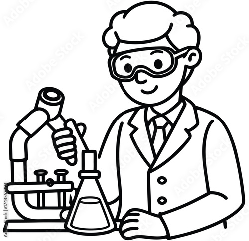 Scientist in Lab Coat Conducting Experiment with Microscope and Flask - Black and White Line Art