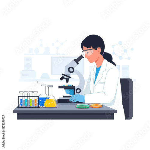 laboratory, science, research, scientist, microscope, biology, chemistry, experiment, analysis, medicals, health care, innovation, discovery, technology, equipment, study, exam, health, genetic, datum, professional, woman, female, technician, researcher, clinical, pharmaceutical, development, molecular, structure, beaker, test, tube, petri, dish, laboratory, coat, safety, investigation, learning, education, background, workplace, detailed, view, visual, illustration, graphic, modern