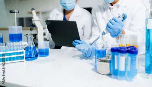 Scientist team meeting and writing analysis results in the laboratory study and analyze scientific sample