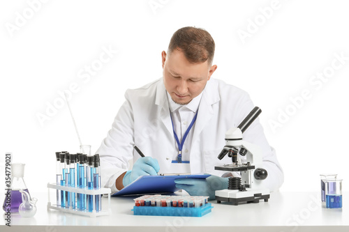 Scientist working with microscope on white background