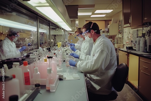 Scientists in a lab simulating Martian conditions, testing the survival of microorganisms in astrobiology experiments.