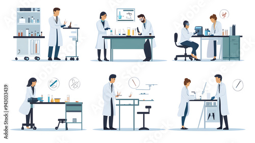 Scientists in laboratory wearing lab coats flat style illustration set isolated on a white background