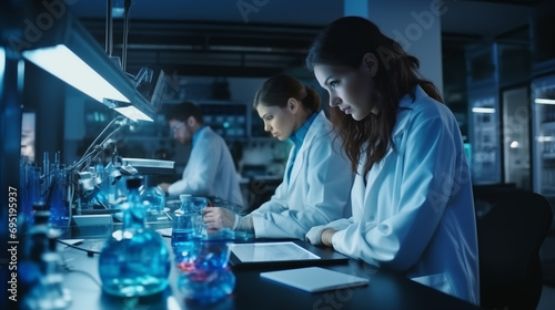 Scientists working in a lab, with vials. Taking notes and experimenting.