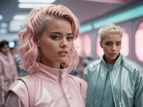 adult, portrait, jacket, model, outfit, pastel, people, person, pink, pointing, posing, indoor, screen, space, studio, style, stylish, technology, virtual, wearing, white, woman, isolated, indoor, attire, elegant, attractive, background, beautiful, bright, brunette, caucasian, computer, copy, digital, emotion, coiffure, european, fashion, fashionable, female, indexed, futuristic
