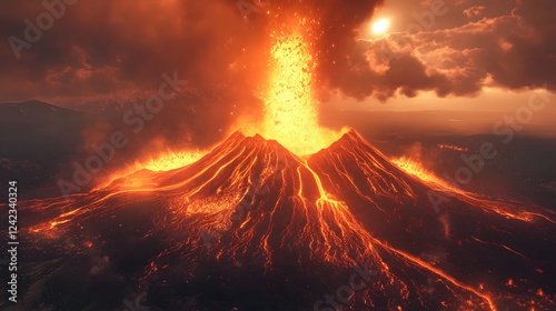 Scorching Volcanic Eruption Unleashing Fiery Lava and Explosive Pyroclastic Flows in a Dramatic Landscape