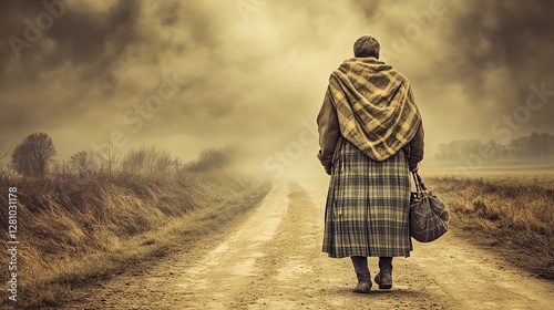scottish, man, kilt, walking, misty, moor, carrying, bagpipe, wearing, plaid, cloak, road, fog, nature, landscape, tradition, culture, heritage, scenery, journey, attire, rural, scotland, folklore, music, peace, solitude, exploration, lonely, mystical, grey, sky, vintage, atmosphere, tranquil, art, classic, dramatic, scenic, quiet, calm, path, character, history, picturesque, adventure, environment, foggy