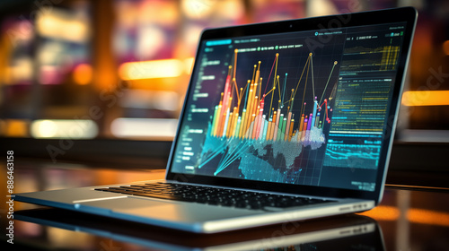 Screen computer laptop device, Displaying colorful website traffic metrics with graphs and analysis for rank of blog on internet online.