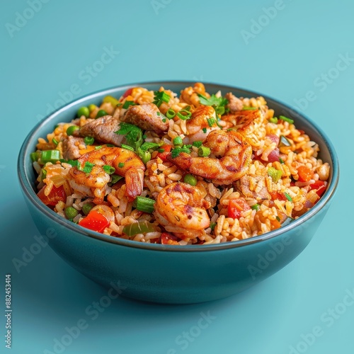 Scrumptious and colorful shrimp and pork fried rice with vegetables in a bowl