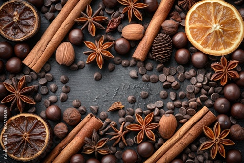 chocolate, nut, spice, orange, cinnamon, anise, nutmeg, cocoa, dark, background, assortment, deliciously, delicious, edible, food, sweet, treat, dessert, snack, baking, cooking, epicure, luxury, rich, decadent, favor, aroma, texture, indulgence, pleasure, satisfaction, happiness, joy, celebration, holiday, winter, christmas, thanksgiving, new year, party, gathering, togetherness, family, friends, love, sharing, caring