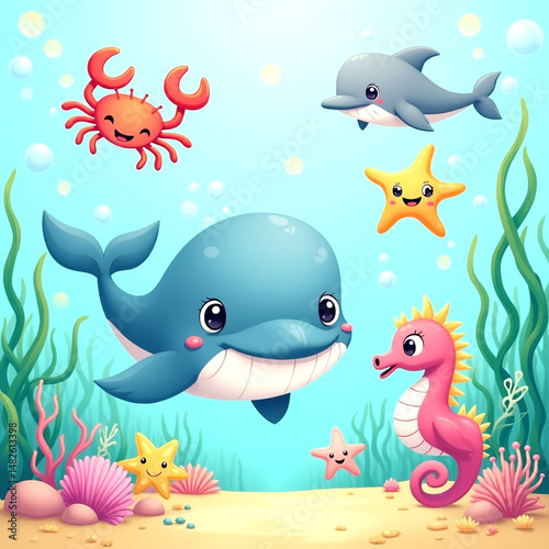 fish, sea, cartoon, animal, vector, ocean, water, illustration, shark, dolphin, set, octopus, animal, aquarium, underwater, whale, starfish, marin, nature, seamless, baby, crab, tropical, life, jellyfish