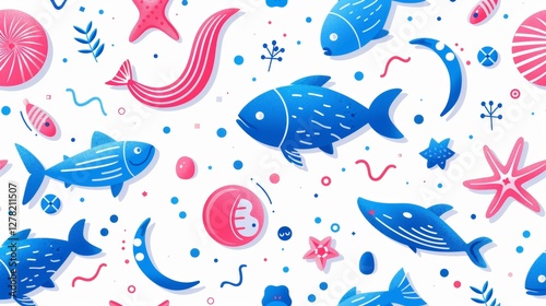 seamless, pattern, fish, ocean, underwater, colourful, background, decorative, marin, animal, illustration, sea, star, seamless pattern, ocean life, seaweed, coral, abstract, geometric, design, oceanic, marine life, blue, pink, whimsical, cute, modern, art, graphic, vector, repeat, marine animal, children, children, sea turtle, seahorse, starfish, ocean floor, bubble