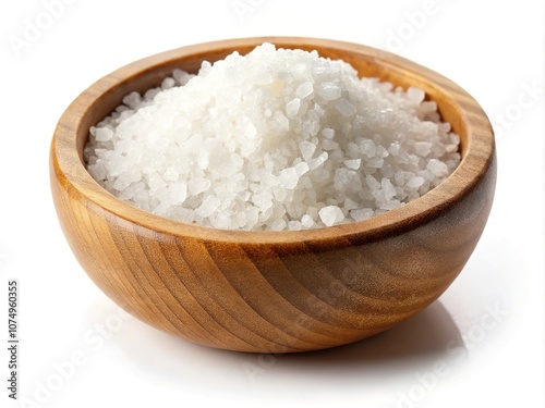 Sea salt, wooden bowl, white backdrop. Food photography, highlighting textures.