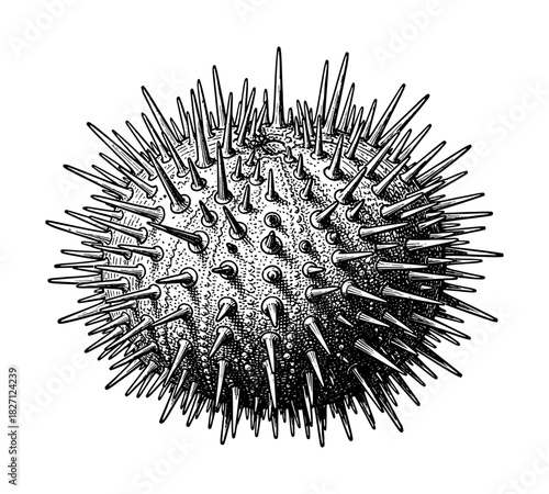 sea urchin, animal, marin, ocean, vector, line art, engraving, retro, vintage, illustration, isolated, black-and-white, drawing, vignetting, nature, wildlife, design, biology, anatomy