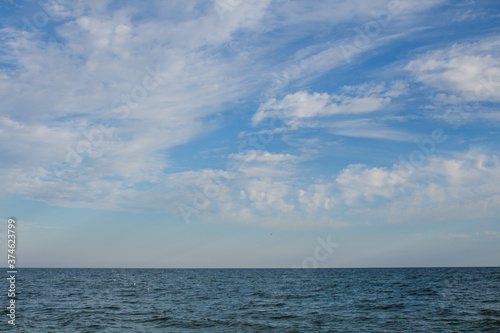sea water with blue bowls and clouds