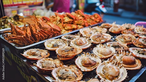 Seafood delicacies display at a market stall.