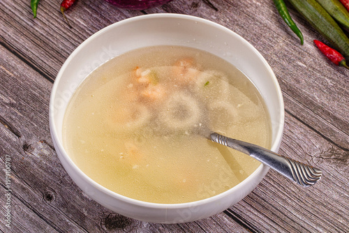 Seafood soup with shrimp and calamari in a bowl on a rustic wooden table with fresh vegetables.