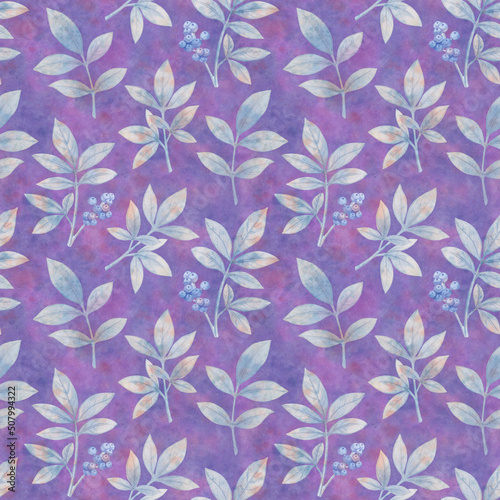Seamless abstract pattern of leaves and berries painted in watercolor. Botanical pattern on a bright abstract background.