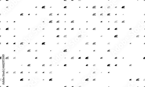 Seamless background pattern of evenly spaced black funny frogs of different sizes and opacity. Illustration on transparent background