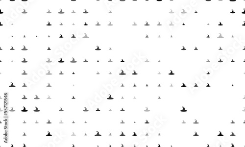 Seamless background pattern of evenly spaced black witch hat symbols of different sizes and opacity. Vector illustration on white background