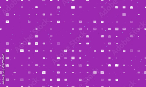 Seamless background pattern of evenly spaced white email symbols of different sizes and opacity. Vector illustration on purple background with stars