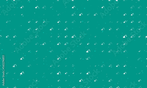 Seamless background pattern of evenly spaced white excavator symbols of different sizes and opacity. Vector illustration on teal background with stars