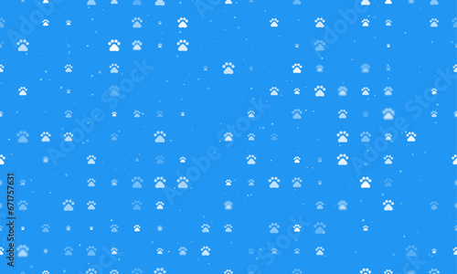 Seamless background pattern of evenly spaced white pet symbols of different sizes and opacity. Vector illustration on blue background with stars