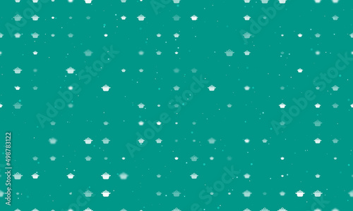 Seamless background pattern of evenly spaced white pot symbols of different sizes and opacity. Vector illustration on teal background with stars