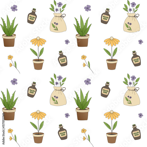 Seamless botanical pattern with aloe, calendula, herbal sachets and glass bottles. Great for wrapping paper, fabric, organic packaging and wellness brands.