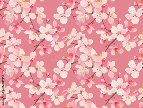 seamless pattern, texture, background, wallpaper, wrapping paper, textile, fabric, design, illustration, graphic, digital, art, drawing, floral, flower, bloom, blossom, sakura, cherry, spring, japan, japanese, asia, oriental, nature, garden, botanical, plant, abstract, modern, trendy, elegant, beautiful, sweet, tender, motif, template, season, wedding, invitation, femininity, organic, pink, tree, tree branch, beauty, decoration, pastel
