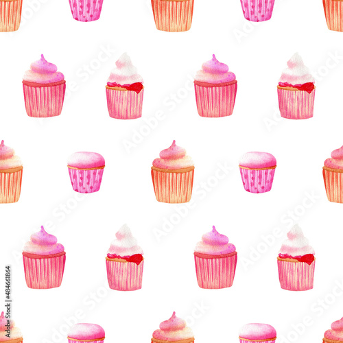 Seamless cupcakes pattern. Watercolor sweets background with backing, cake. Food illustration for fabric, valentines day decor, wrapping paper