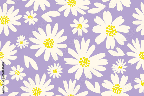 Seamless daisy floral pattern with white petals and yellow centers on a soft lavender background—perfect for spring designs, textiles, and cheerful wallpapers.