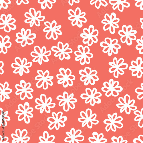 Seamless floral pattern background in trendy color of 2019, living coral, endless hand drawing abstract doodle of falling bloom flowers with petals. Vector.